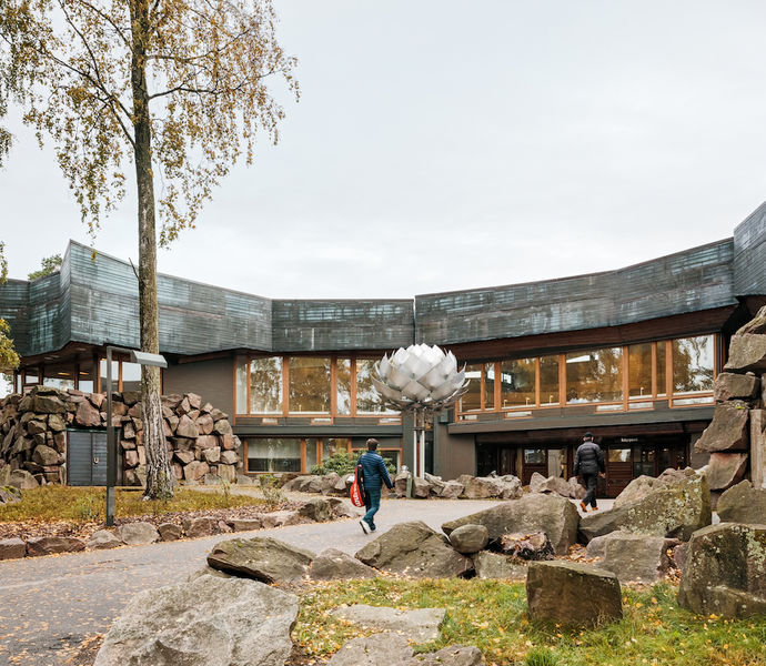 Vi besöker sedan Tammerfors stadsbiblioteket Metso ritat av arkitektparet Reima och Raili Pietilä. Byggnaden invigdes 1986 och är ett exempel på organisk arkitektur som uppifrån har formen av en tjädertupp, därav smeknamnet Metso (tjäder på finska). Inspirationen kom från keltiska ornament, djurskelett och isälvsformationer med ett spiralformat inre landskap utan räta vinklar där även möbler och beslag specialritades. Huset blev ett riktmärke för finsk postmodernism. Byggnaden renoverades 2011–2017 under ledning av arkitekt Marko Suutarka där stor hänsyn togs till det ursprungliga utseendet. Renoveringen tilldelades Tammerfors stads tillgänglighetspris 2017.