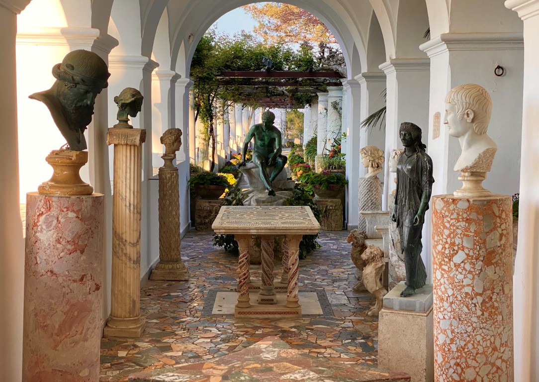 Resans ciceron Hans Lepp och reseledare Anna Rudh möter med skylt i ankomsthallen på Neapels flygplats. Busstransfer till Neapels hamn och snabbfärja till Capri. Från hamnen i Capri fortsätter vi med buss till Villa San Michele där vi installerar oss på gästhemmet. Vi återsamlas för en välkomstdrink och introduktion samt guidning med villans direktör Kristina Kappelin, välkänd författare och tidigare SVT-korrespondent.