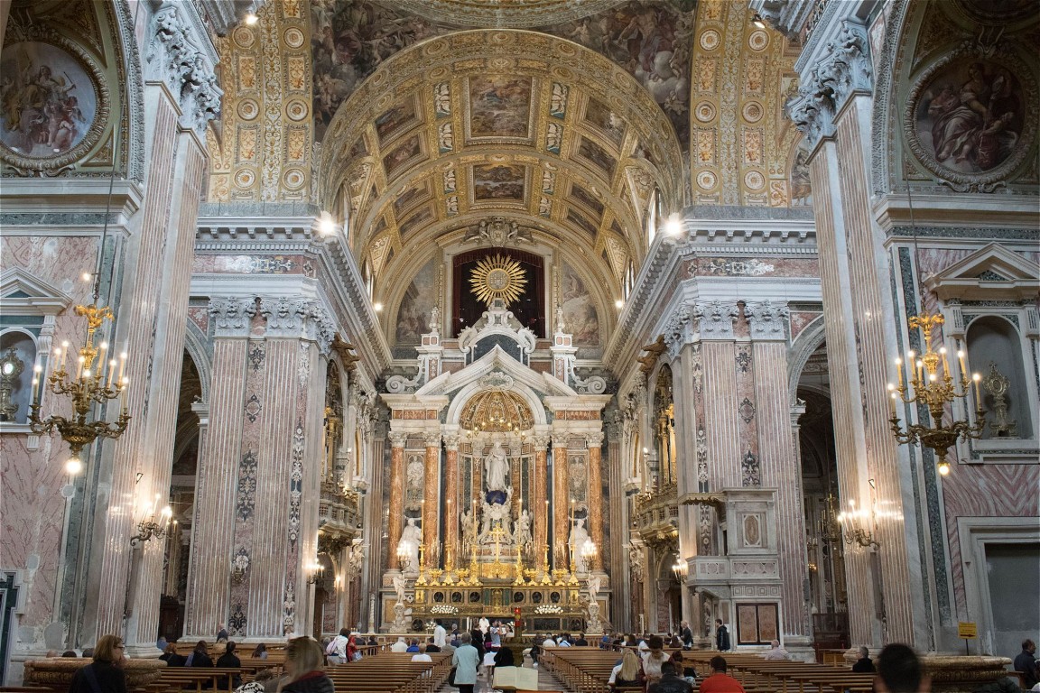 Under vår promenad ser vi kvarteren runt den långa gatan Spaccanapoli. Vi besöker Gesù Nuovo, uppförd 1470 som palats av prins Roberto Sanseverino men omvandlades till kyrka i samband med jesuiternas övertagande under slutet av 1500-talet. Efter att jesuitorden upplöstes 1773 tog franciskanerna över kyrkan fram till 1900-talet, då jesuiterna återvände. Kyrkan är känd för sin storslagna barockinteriör och för relikerna av San Giuseppe Moscati som är ett populärt pilgrimsmål.