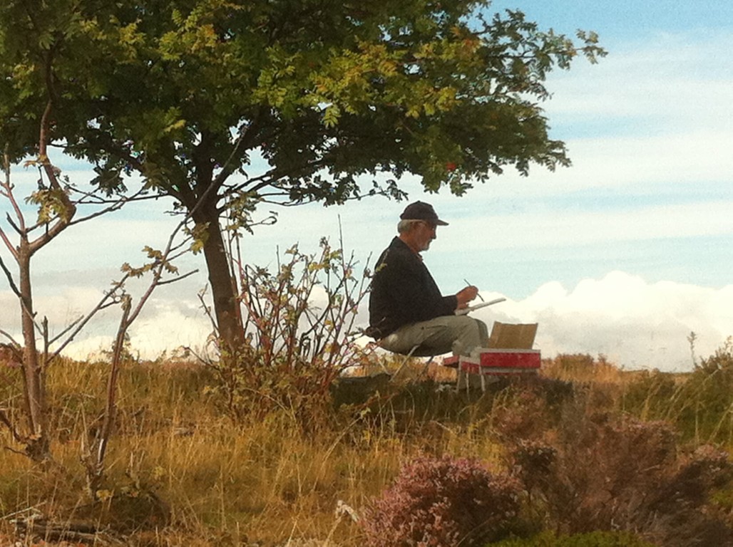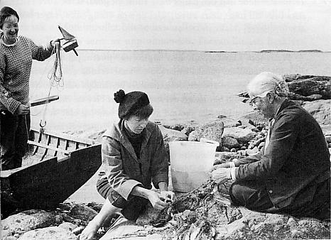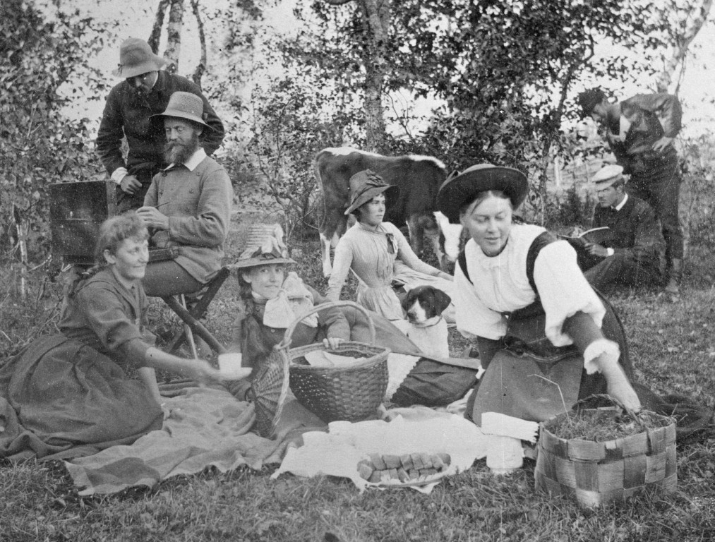 Önningebykolonister den första sommaren 1886. Sittande på marken från vänster Hanna Rönnberg, Hilma Westerholm, Elin Danielson och Nina Ahlstedt. Sittande i stol till vänster Alexander Federley och stående intill Victor Westerholm. Foto av Aksel Paul (1863-1927). På fotot till höger ser vi kolonins grundare Victor Westerholm målandes på en tavla.