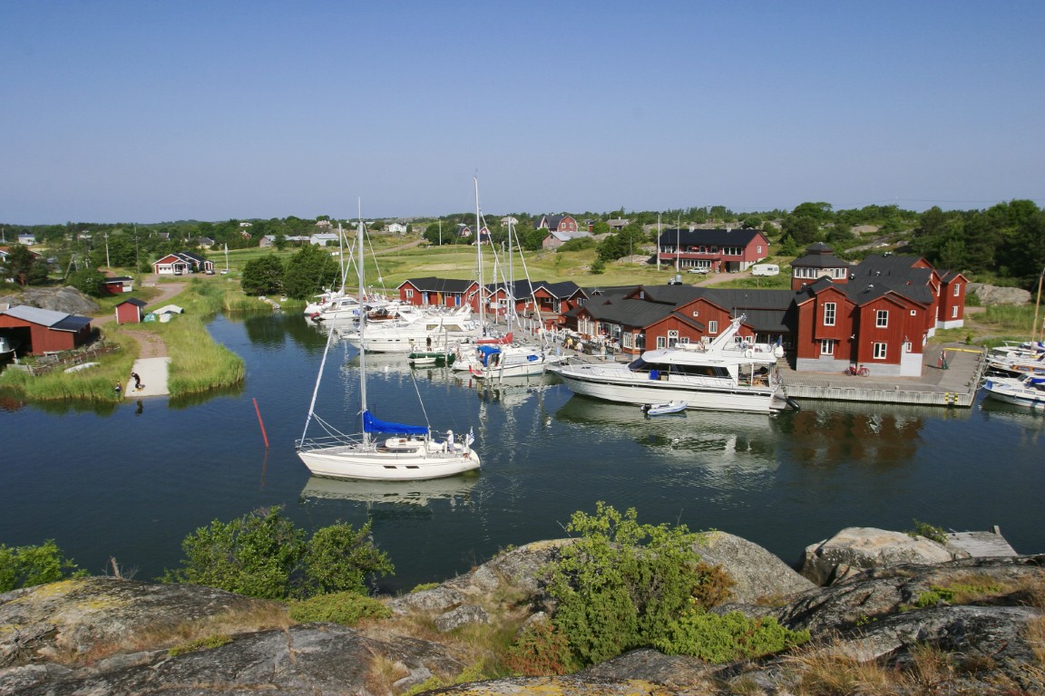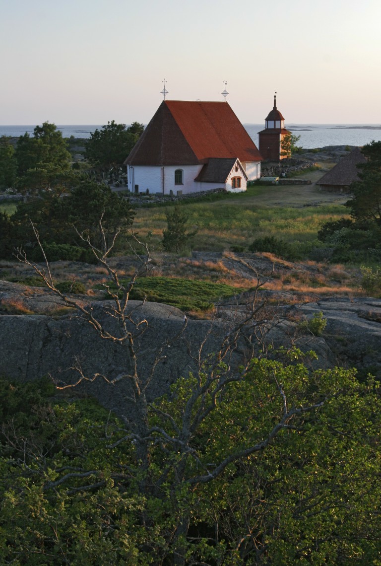Hamnen på Kökar och Hotell Brudhäll där vi bor under kursen. Kyrkan St:a Anna. Foto: Viking Line.