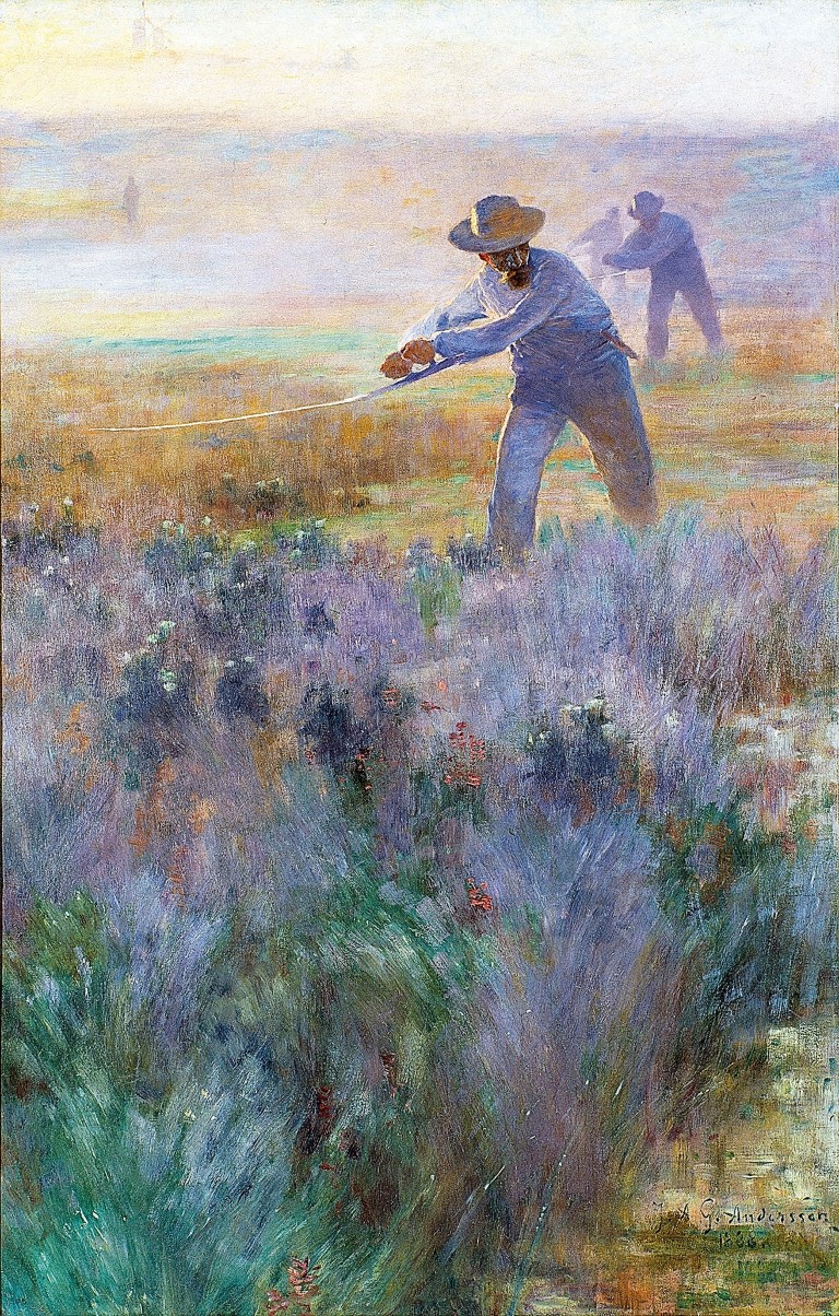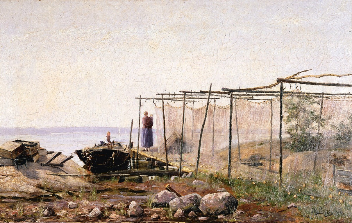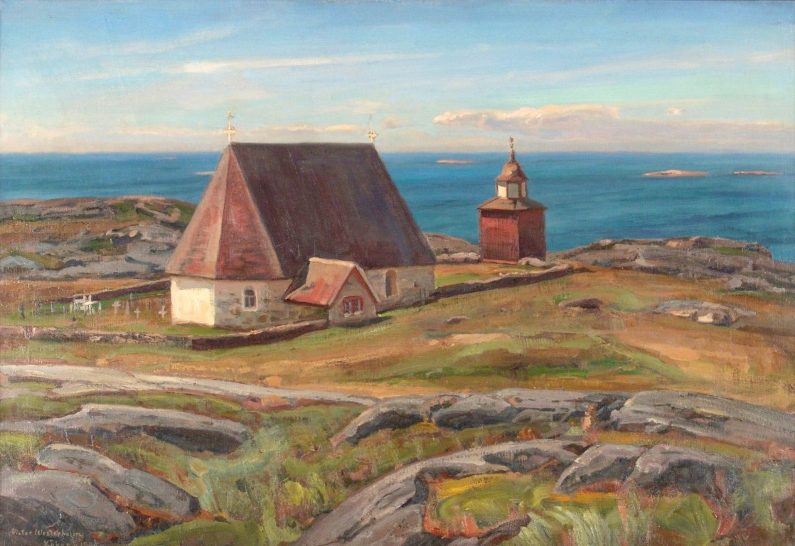 Målningar av konstnärer i Önningebykolonin Hanna Rönnberg, J.A.G. Acke och Ida Gisiko-Spärck med motiv från Åland. Foto: Önningebymuseet.