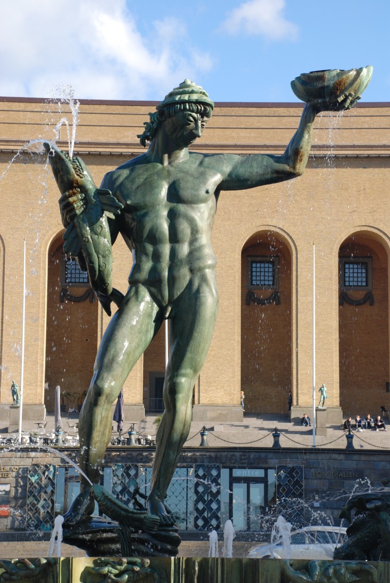 Carl Milles Poseidonstaty på Götaplatsen med Göteborgs konstmuseum i bakgrunden. P.S. Krøyer Hipp, hipp, hurra! Konstnärsfest på Skagen, 1887-1888. Göteborgs konstmuseum.