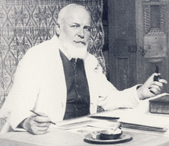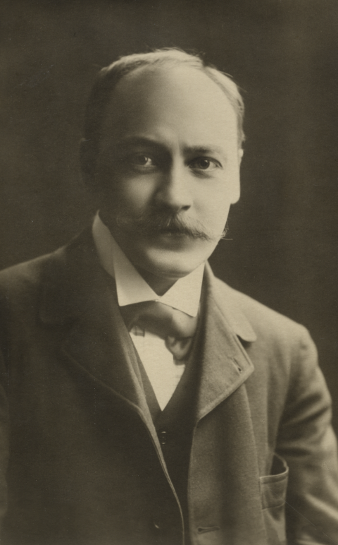 Emma och Anders Zorn framför Zorngården 1910. Självporträtt av Zorn och målningen Dans i Gopsmorstugan från 1914.